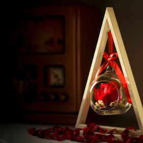 Kompozice kužel se stabilizovanou růží (kužel slouží jako dárková krabička a obsahuje vždy dárek)