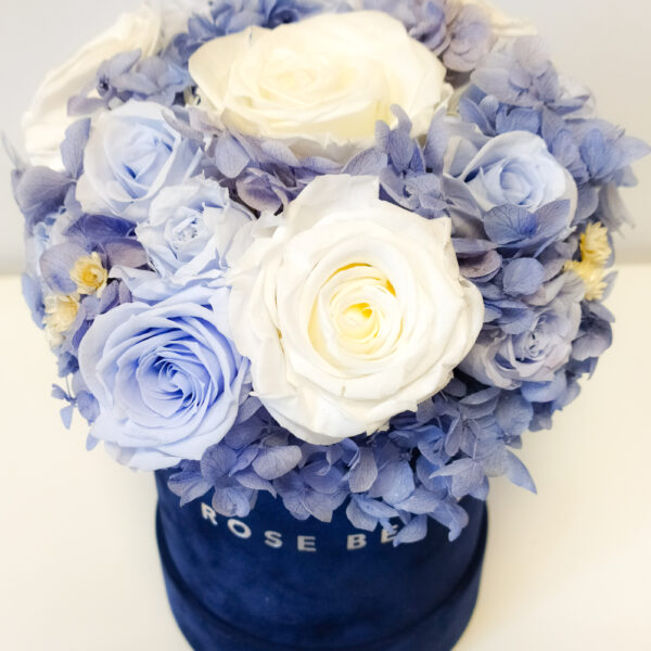 Barevné složení růží a tuberózy, zakomponované v modrém sametovém boxu. Skutečná slast pro oči a dokonalý dárek pro milovníky jemných barev. Box se sametovým povrchem a stabilizovanými / věčnými růžemi je jedinečnou kombinací dokonalosti a krásy. Je ideálním dárkem pro někoho blízkého. Box Rose Belle je výjimečný jemnou eleganci, na dotek velmi příjemný a hladký.