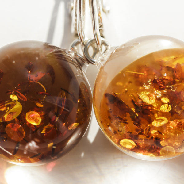 Překrásné náušnice vyráběné výhradně ručně z nejlepší a nejkvalitnější průhledné pryskyřice (odolné proti UV záření), do které jsou zakomponovány částečky jantaru. Náušnice se krásně třpytí a perfektně vypadají. Velmi lehké a jemné náušnice jsou vhodným dárkem pro milovanou osobu. Vše je baleno do elegantní šperkovnice.