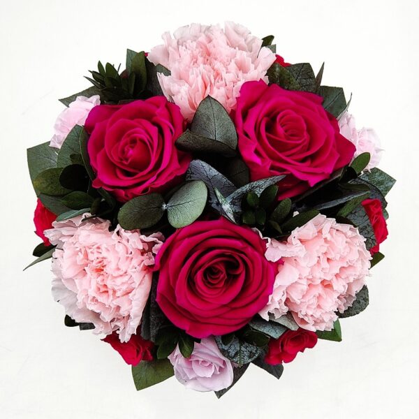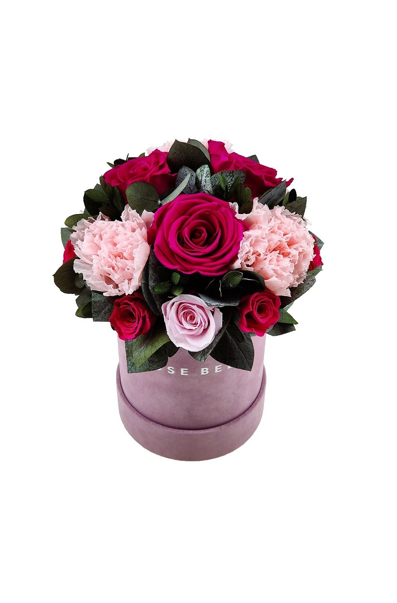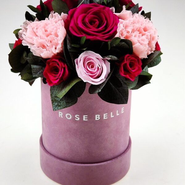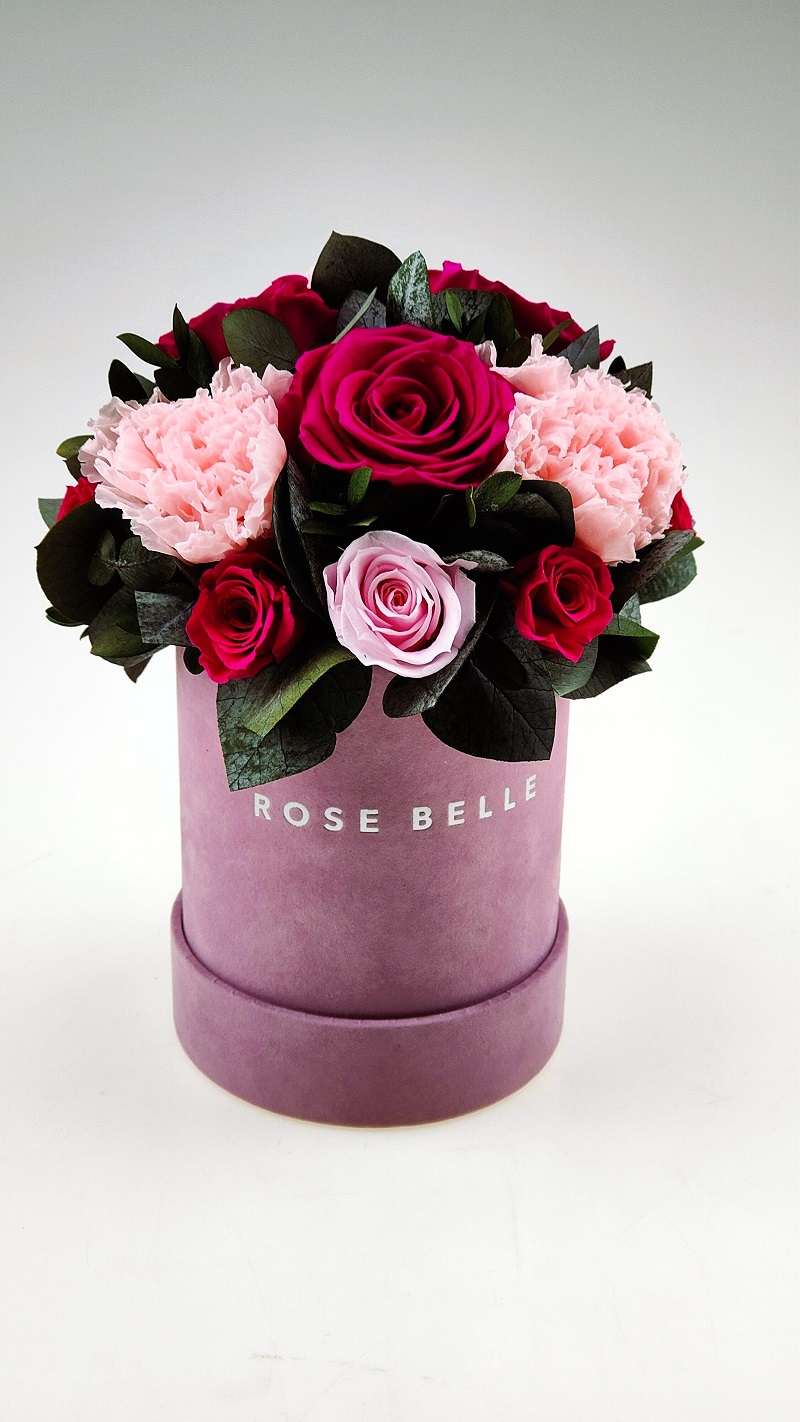 Pastelové barvy a jedinečná kompozice růží, karafiátů a vřesu, zakomponované v boxu růžové barvy. Skutečný unikát pro oči a dokonalý dárek pro milovníky jemných barev. Box se sametovým povrchem a stabilizovanými / věčnými růžemi je jedinečnou kombinací dokonalosti a krásy. Je ideálním dárkem pro někoho blízkého. Box Rose Belle je výjimečný jemnou eleganci, na dotek velmi příjemný a hladký.