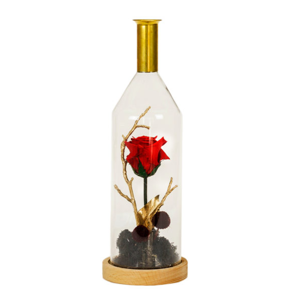 Krásná růže uzavřená ve skleněné (krátká růže) láhvi s větví. Souprava obsahuje skleněnou láhev s oddělitelným dnem, stabilizovanou růži + doplňky, které jsou perfektní součástí růže.