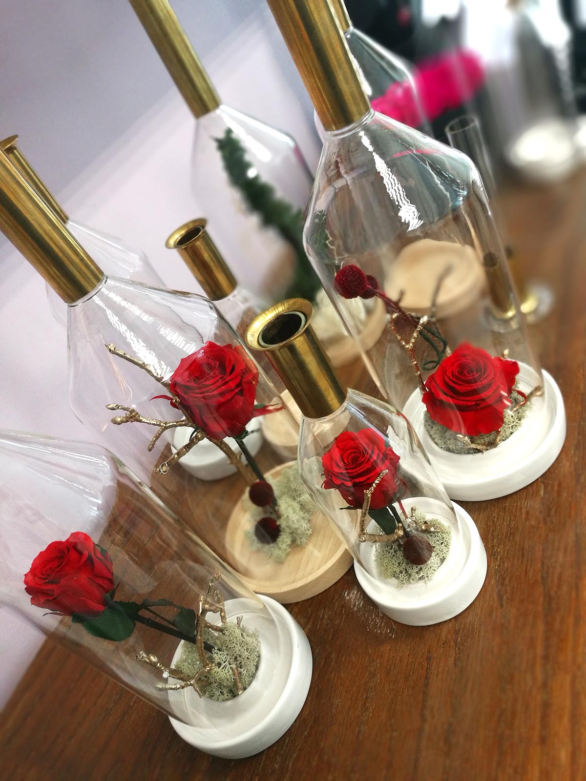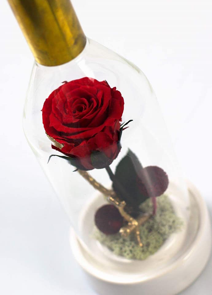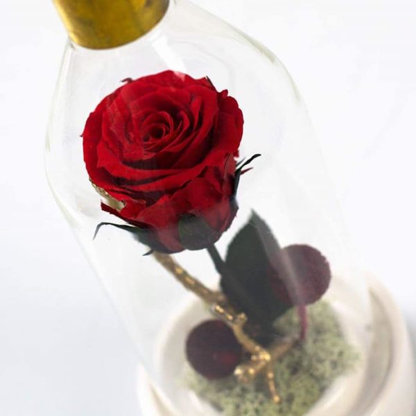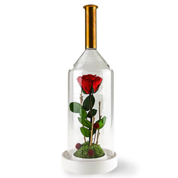 Krásná růže uzavřená ve skleněné (krátká růže) láhvi s větví. Souprava obsahuje skleněnou láhev s oddělitelným dnem, stabilizovanou růži + doplňky, které jsou perfektní součástí růže.